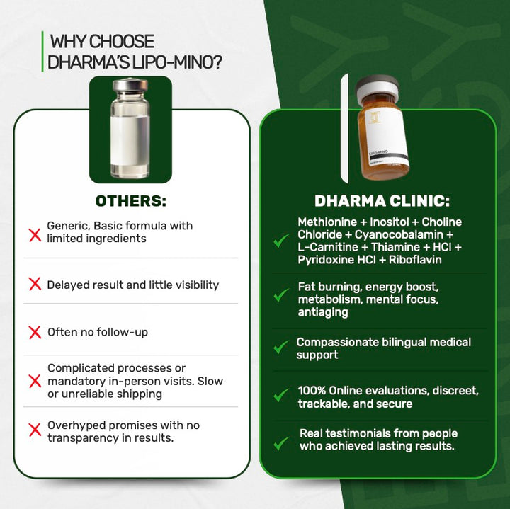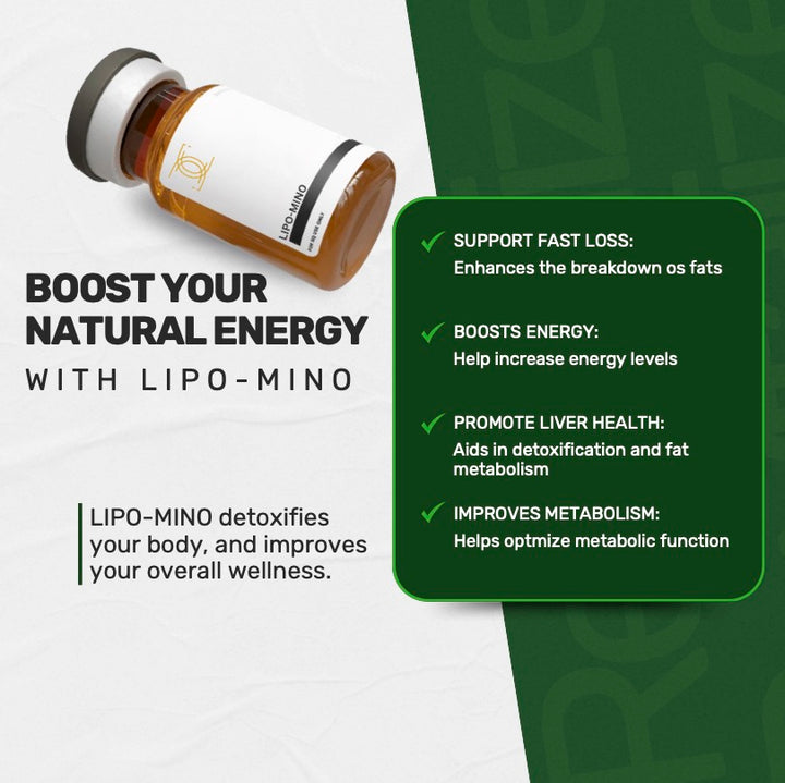 Lipo-Mino is a combination of lipotropic amino acids and B-vitamins: Methionine, Inositol, Choline Chloride, Cyanocobalamin (B12), L-Carnitine, Thiamine HCl (B1), Pyridoxine HCl (B6), and Riboflavin (B2).